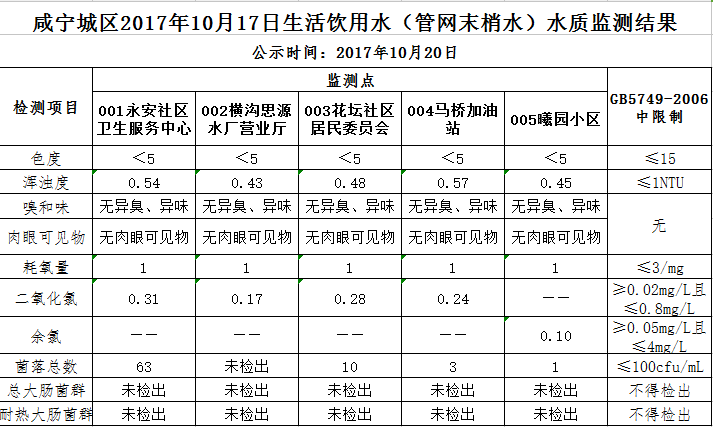 2017年10月20日咸宁城区生活饮用水监测结果公示