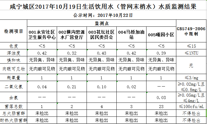 2017年10月22日咸宁城区生活饮用水监测结果公示
