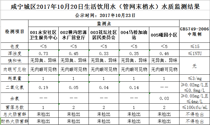 2017年10月23日咸宁城区生活饮用水监测结果公示