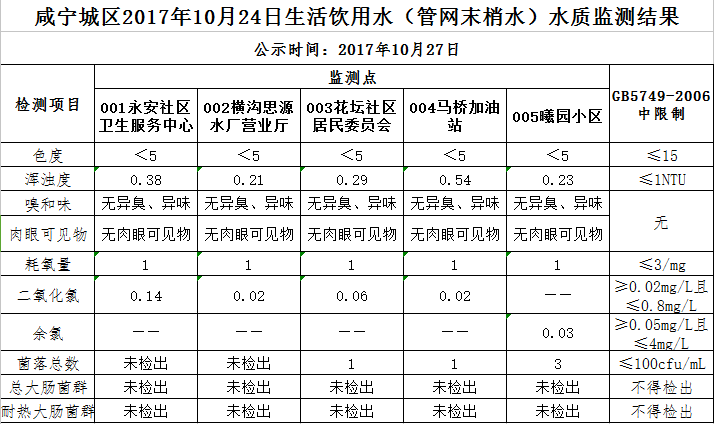 2017年10月27日咸宁城区生活饮用水监测结果公示