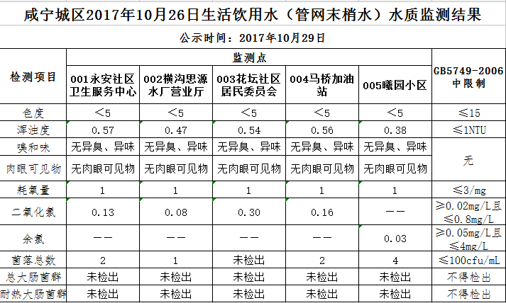 2017年10月29日咸宁城区生活饮用水监测结果公示
