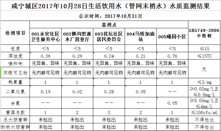 2017年10月31日咸宁城区生活饮用水监测结果公示