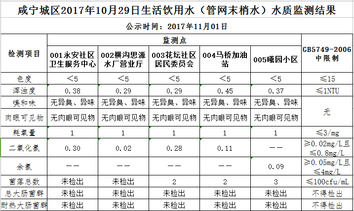2017年10月31日咸宁城区生活饮用水监测结果公示