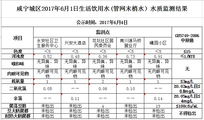 2017年6月4日咸宁城区生活饮用水监测结果公示