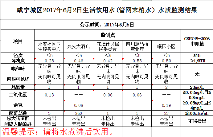 2017年6月5日咸宁城区生活饮用水监测结果公示