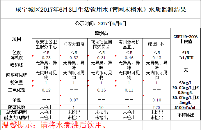 2017年6月6日咸宁城区生活饮用水监测结果公示