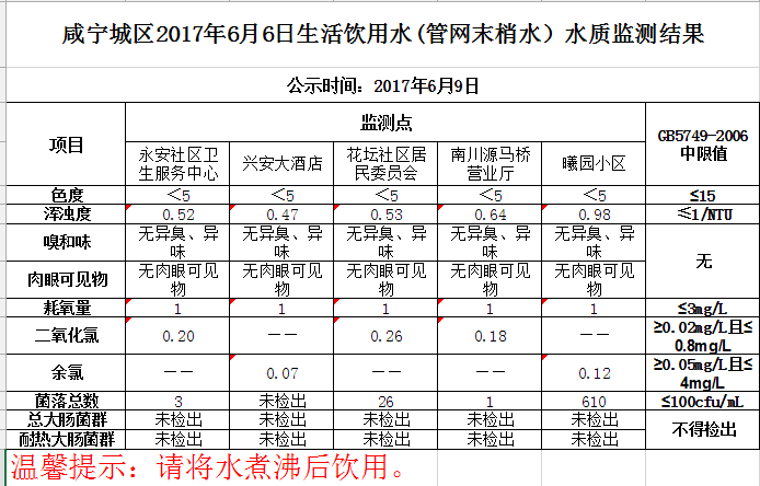 2017年6月9日咸宁城区生活饮用水监测结果公示