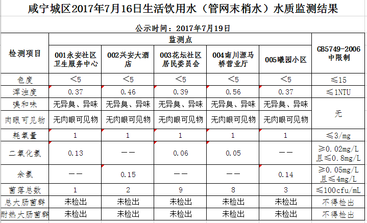 2017年7月19日咸宁城区生活饮用水监测结果公示