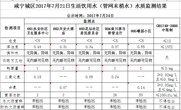 2017年7月24日咸宁城区生活饮用水监测结果公示