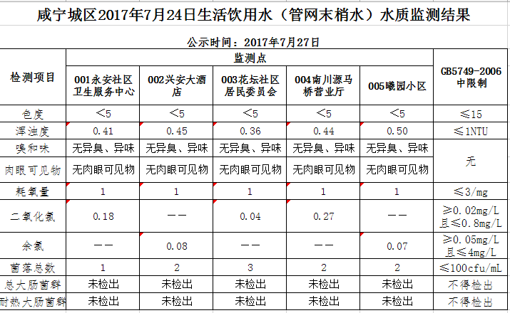 2017年7月27日咸宁城区生活饮用水监测结果公示