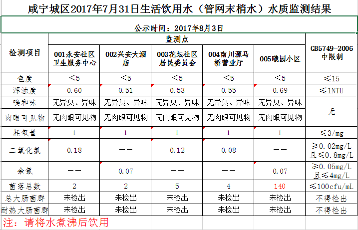 2017年8月3日咸宁城区生活饮用水监测结果公示
