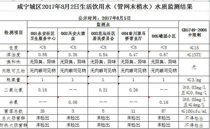2017年8月5日咸宁城区生活饮用水监测结果公示