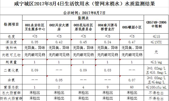 2017年8月8日咸宁城区生活饮用水监测结果公示