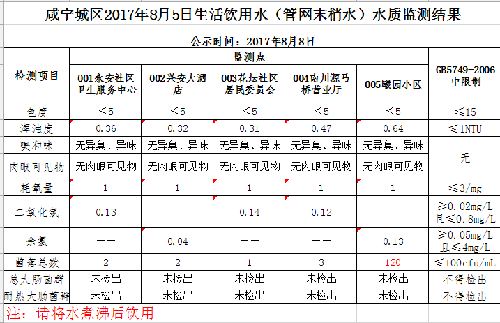 2017年8月8日咸宁城区生活饮用水监测结果公示