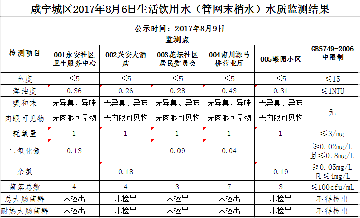 2017年8月10日咸宁城区生活饮用水监测结果公示