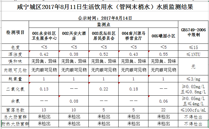 2017年8月14日咸宁城区生活饮用水监测结果公示