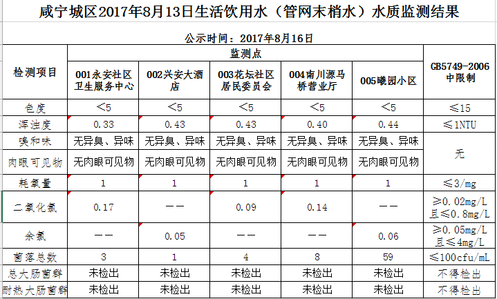2017年8月17日咸宁城区生活饮用水监测结果公示