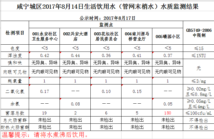 2017年8月17日咸宁城区生活饮用水监测结果公示