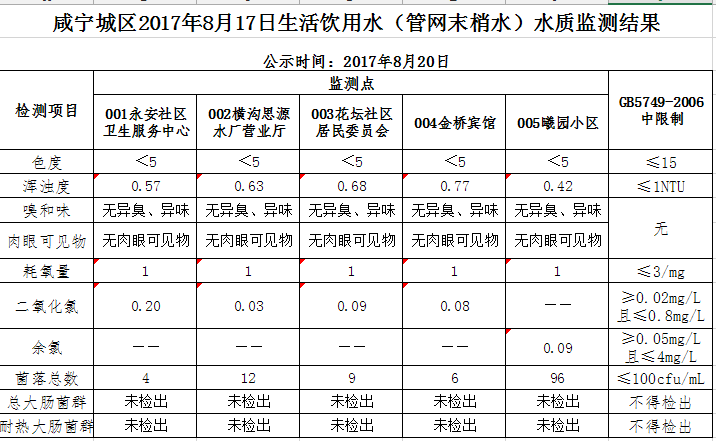 2017年8月20日咸宁城区生活饮用水监测结果公示