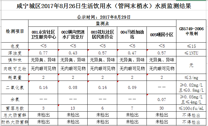 2017年8月29日咸宁城区生活饮用水监测结果公示