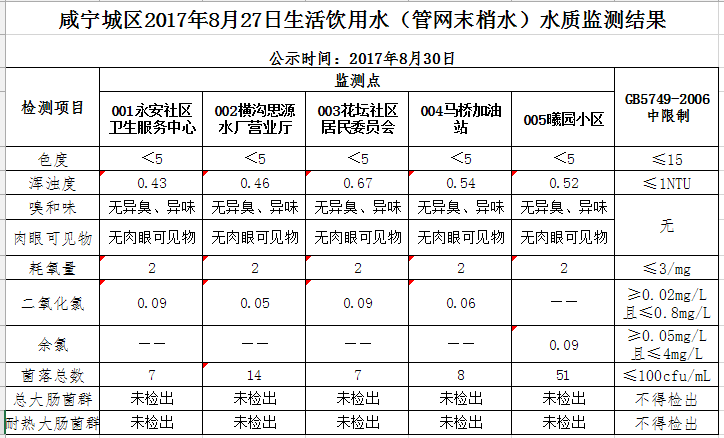 2017年8月30日咸宁城区生活饮用水监测结果公示
