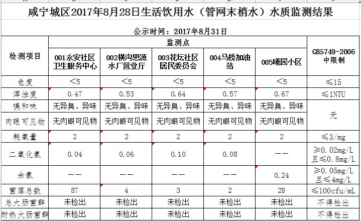 2017年8月31日咸宁城区生活饮用水监测结果公示