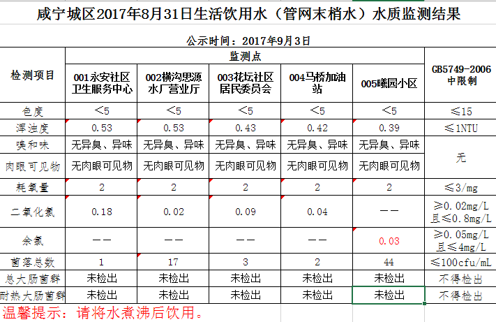 2017年9月3日咸宁城区生活饮用水监测结果公示