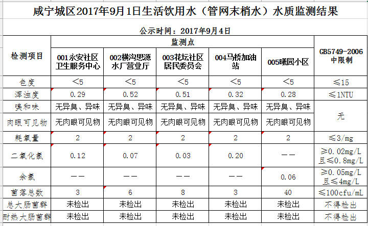 2017年9月4日咸宁城区生活饮用水监测结果公示