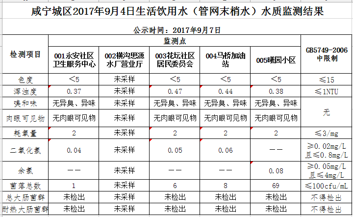 2017年9月6日咸宁城区生活饮用水监测结果公示