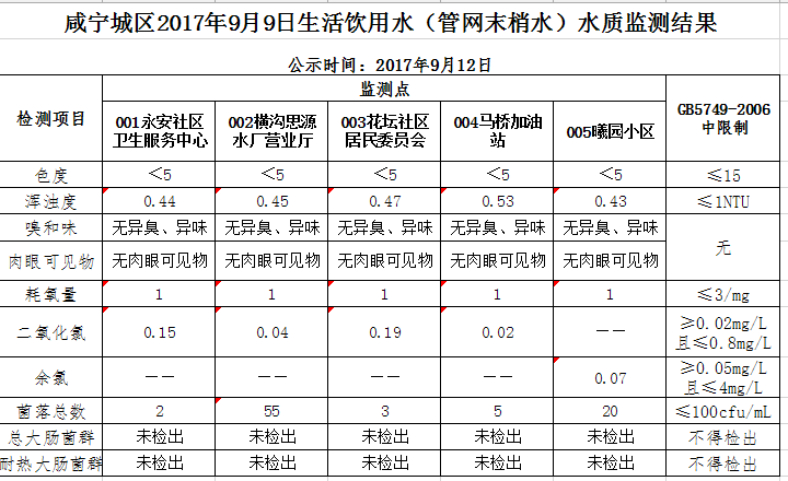2017年9月12日咸宁城区生活饮用水监测结果公示