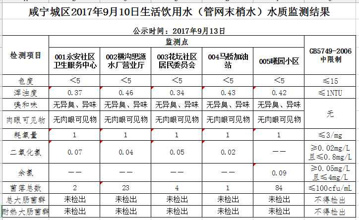 2017年9月13日咸宁城区生活饮用水监测结果公示
