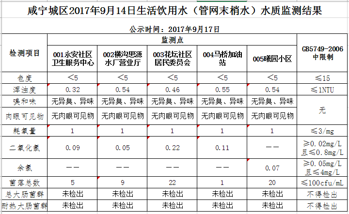 2017年9月17日咸宁城区生活饮用水监测结果公示