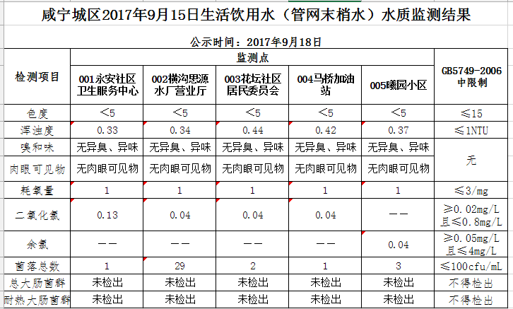 2017年9月17日咸宁城区生活饮用水监测结果公示