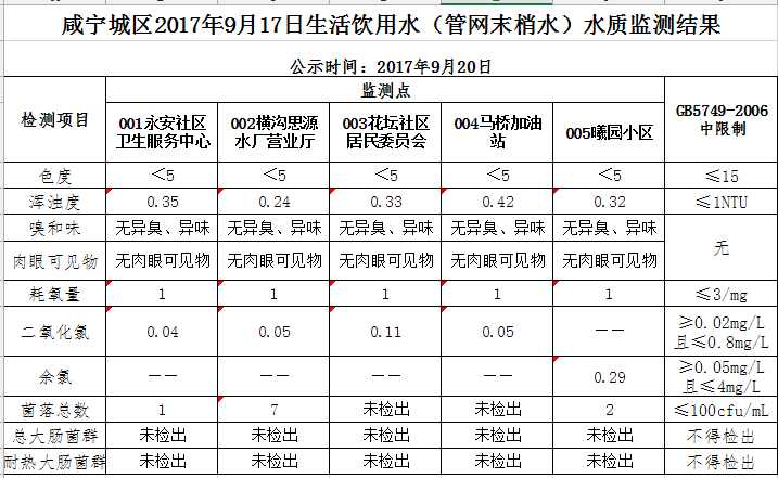 2017年9月20日咸宁城区生活饮用水监测结果公示
