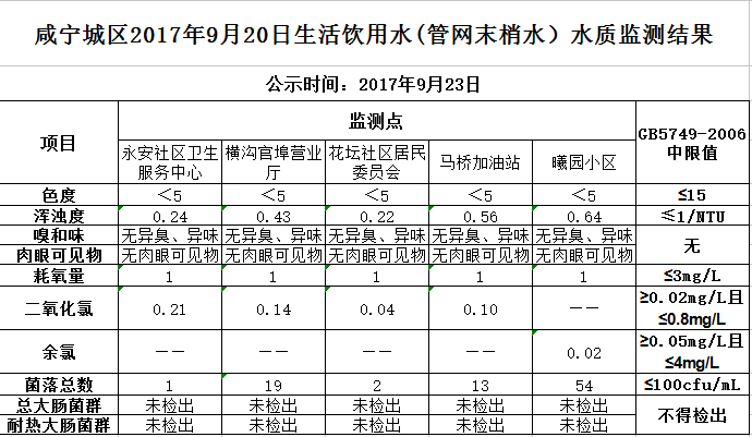 2017年9月23日咸宁城区生活饮用水监测结果公示