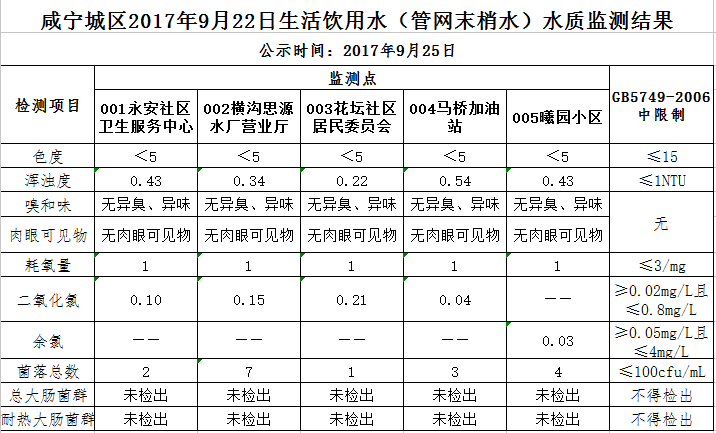 2017年9月25日咸宁城区生活饮用水监测结果公示