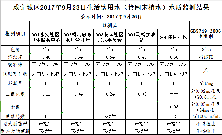 2017年9月26日咸宁城区生活饮用水监测结果公示