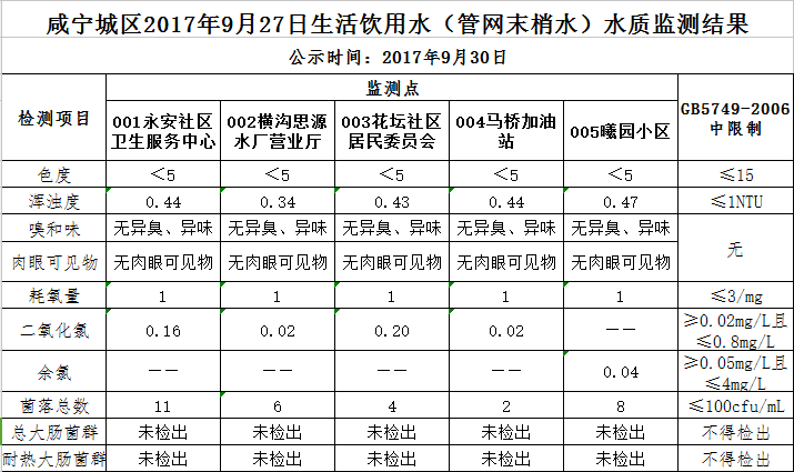 2017年9月30日咸宁城区生活饮用水监测结果公示