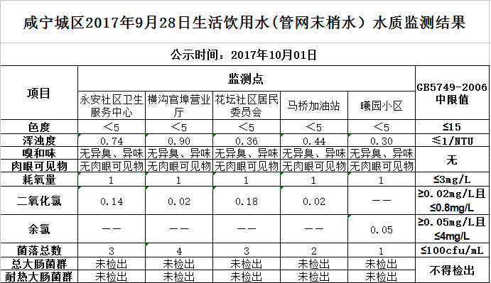2017年10月01日咸宁城区生活饮用水监测结果公示