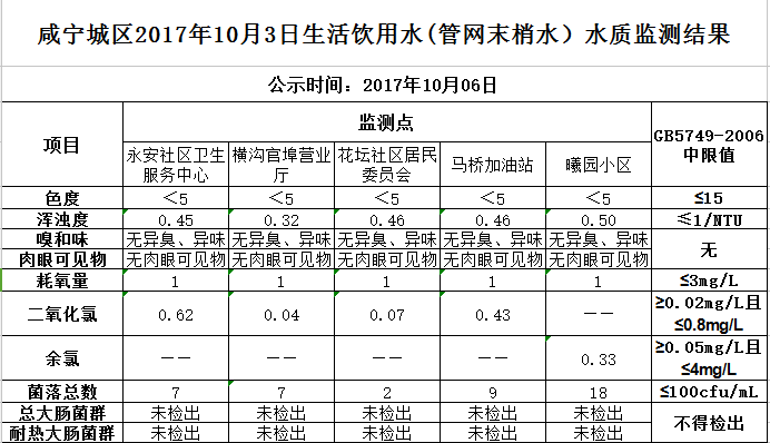 2017年10月6日咸宁城区生活饮用水监测结果公示