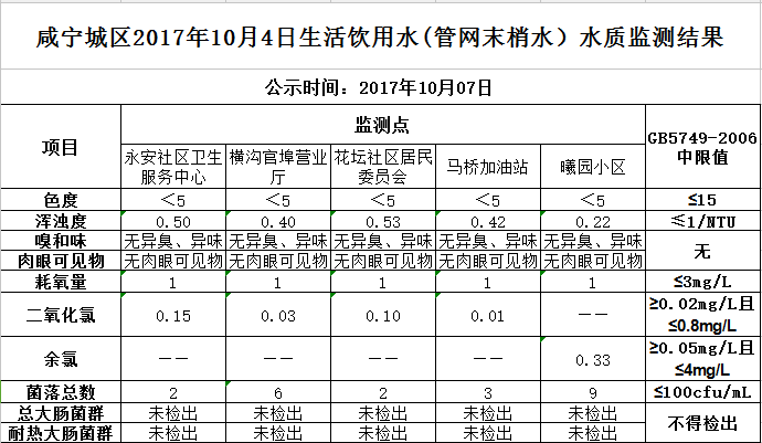 2017年10月6日咸宁城区生活饮用水监测结果公示