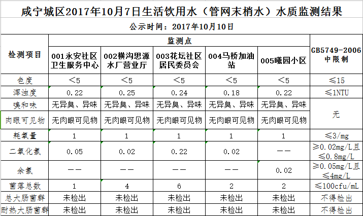 2017年10月10日咸宁城区生活饮用水监测结果公示