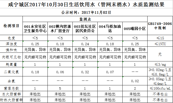 2017年11月2日咸宁城区生活饮用水监测结果公示