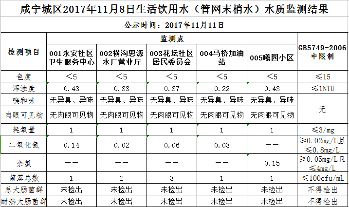 2017年11月11日咸宁城区生活饮用水监测结果公示