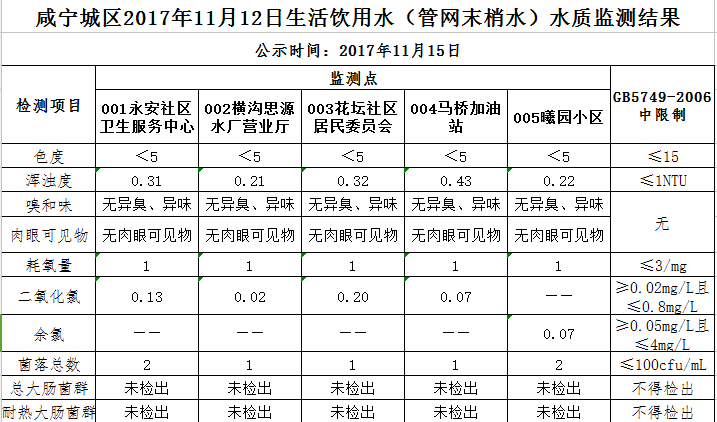 2017年11月15日咸宁城区生活饮用水监测结果公示