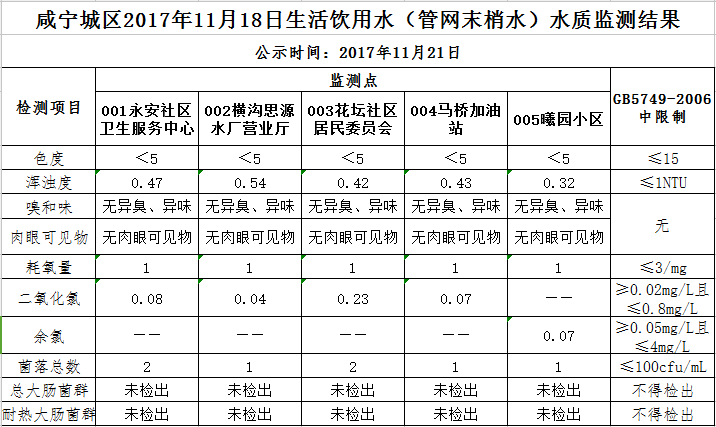 2017年11月20日咸宁城区生活饮用水监测结果公示