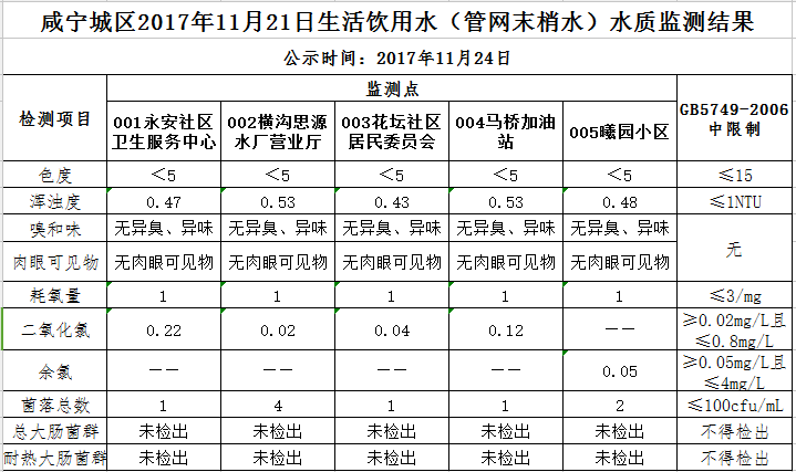 2017年11月24日咸宁城区生活饮用水监测结果公示