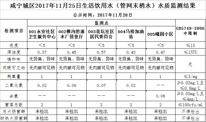 2017年11月28日咸宁城区生活饮用水监测结果公示