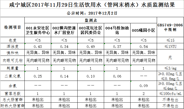 2017年12月2日咸宁城区生活饮用水监测结果公示