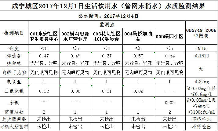 2017年12月3日咸宁城区生活饮用水监测结果公示